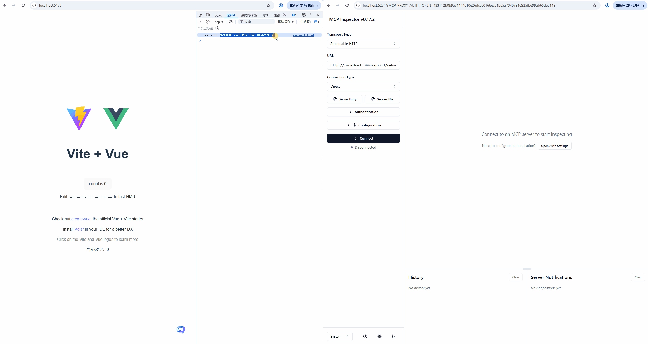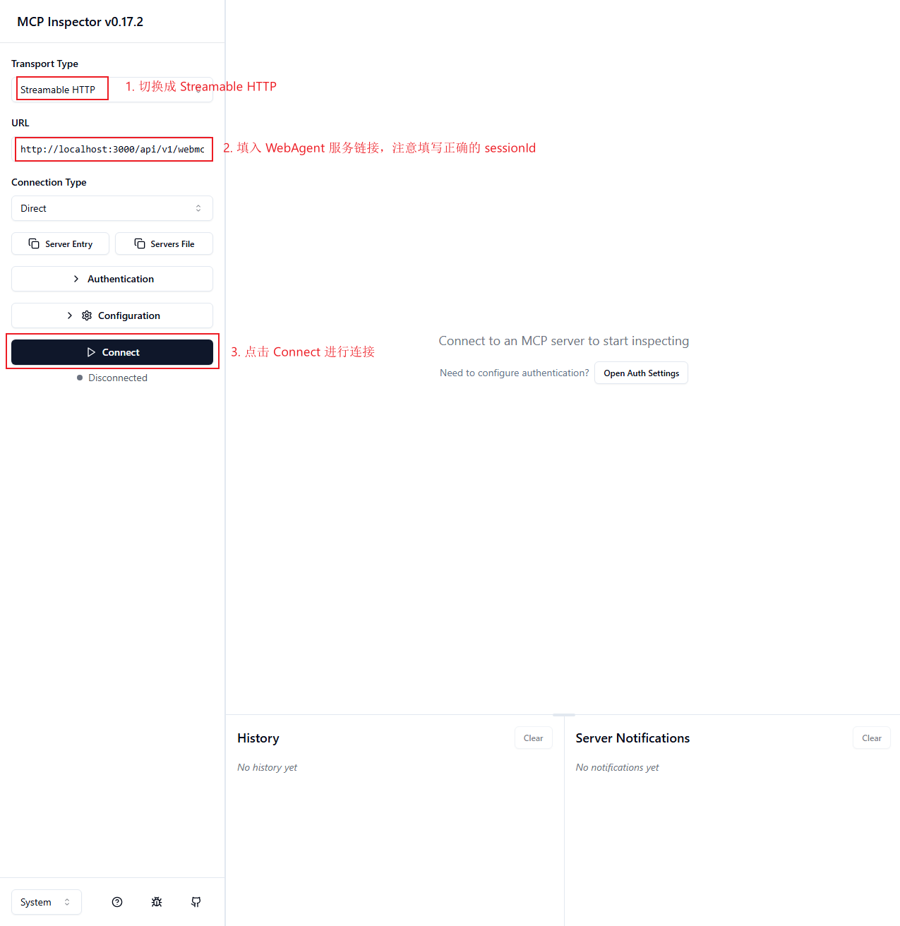 // sessionId 为可选参数。若传入该参数,系统将使用指定值作为会话标识;若未传入,WebAgent 服务将自动生成一个随机的字符串作为 sessionId。为便于通过 MCP Inspector 工具进行调试,此处采用了固定的 sessionId。用户亦可通过浏览器原生提供的 crypto.randomUUID() 方法生成随机字符串作为会话标识。