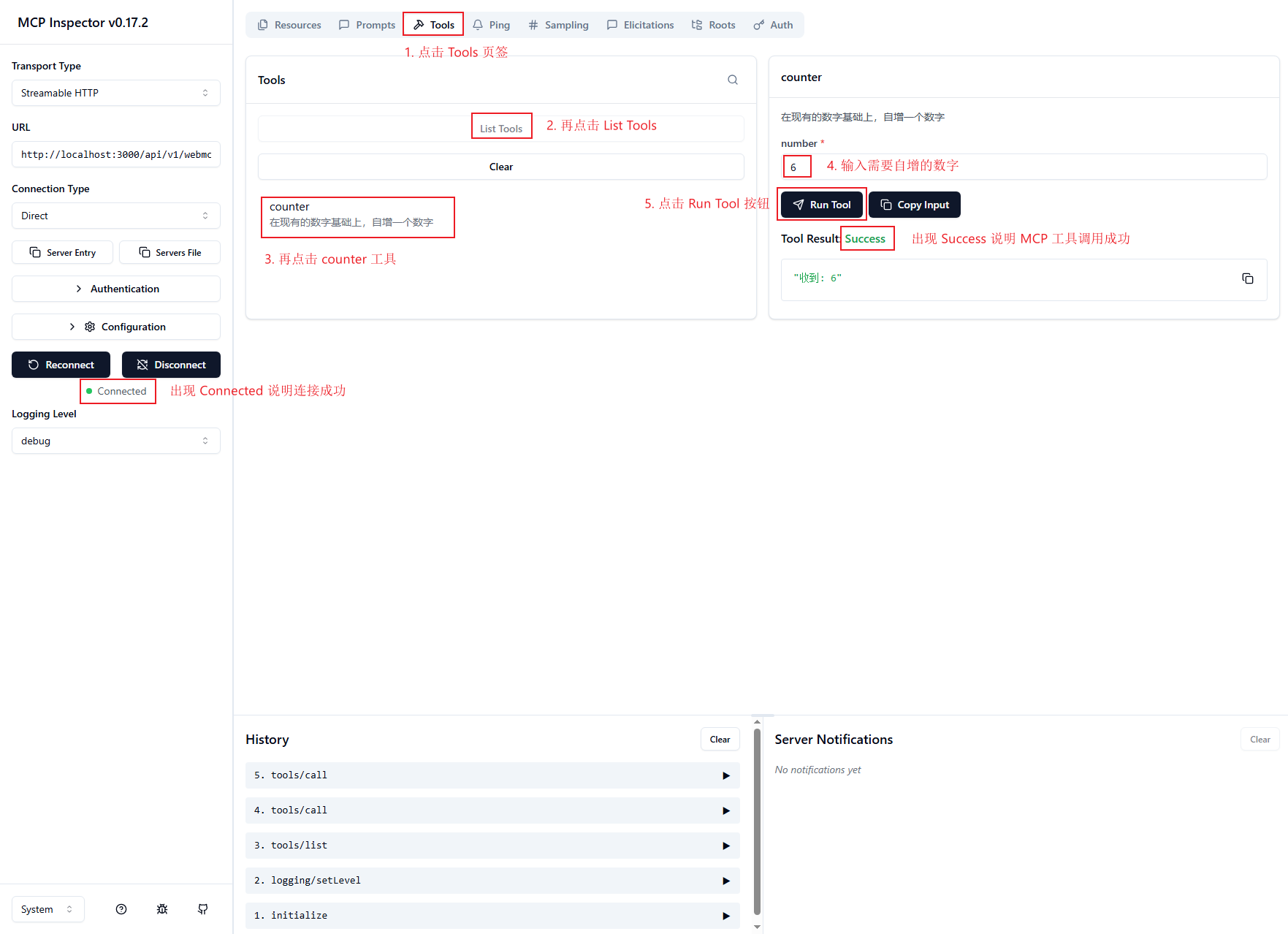 上述动画展示了如何配置 WebAgent 服务的访问地址,并通过 MCP Inspector 工具建立连接。在 Inspector 中可查看 Web 应用中所定义的 MCP 工具,手动调用 counter 工具以执行数字自增操作,并观察其执行结果。