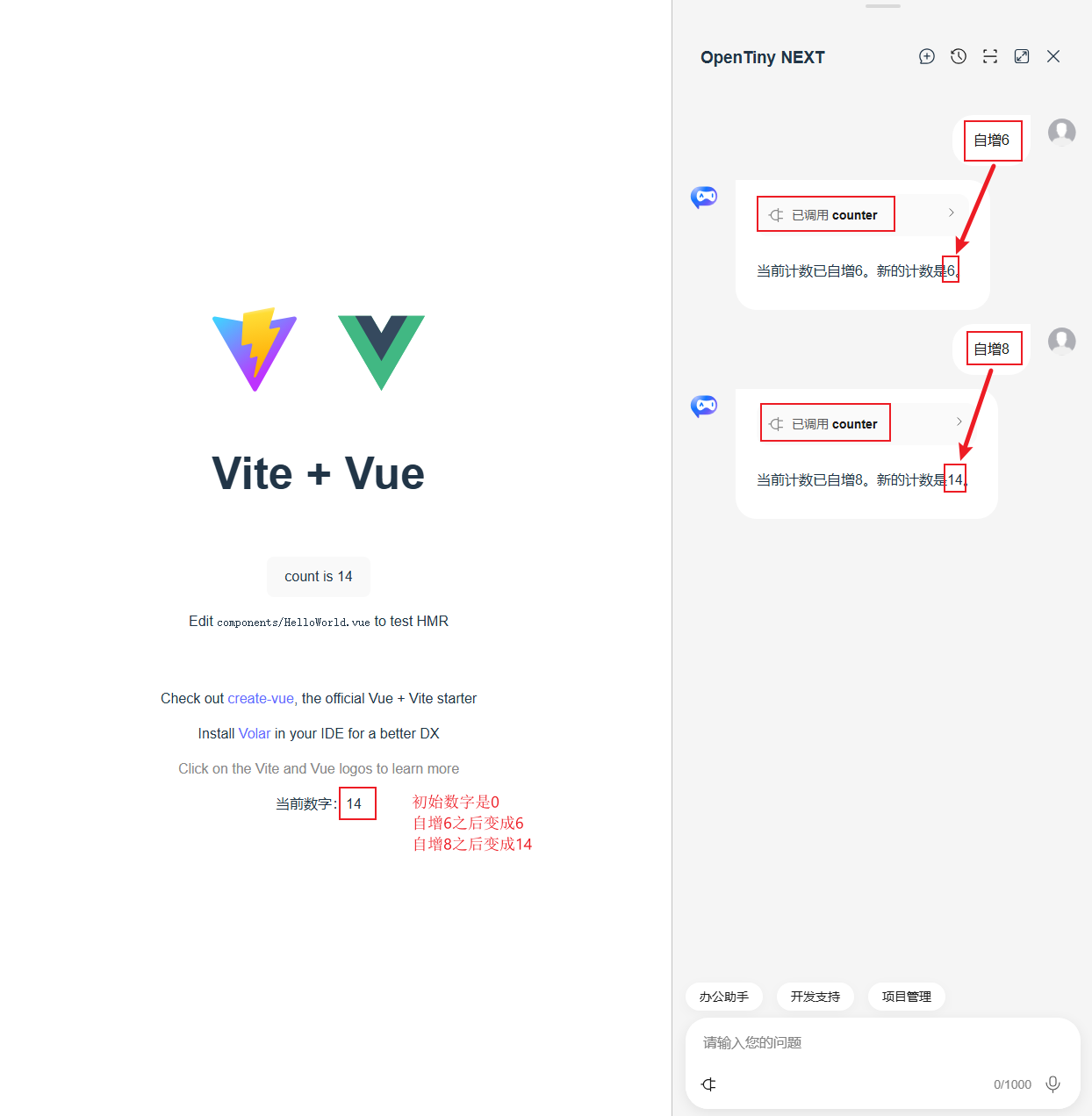 初始状态下,页面中显示的数值为 0。首次调用 counter 工具并传入参数 6 后,页面数值更新为 6(即 0 + 6);再次调用该工具并传入参数 8 后,页面数值更新为 14(即 6 + 8)。