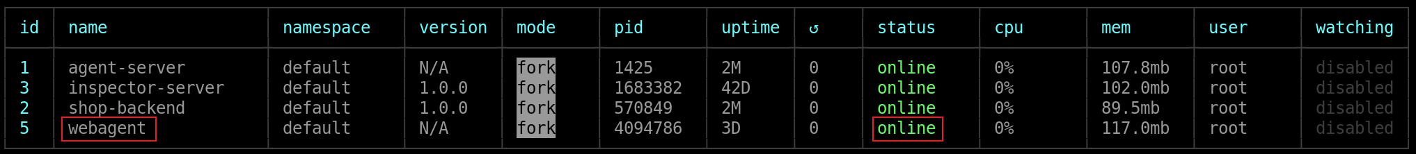 pm2 start index.js --name webagent --env production若控制台出现以下界面,表示启动成功。