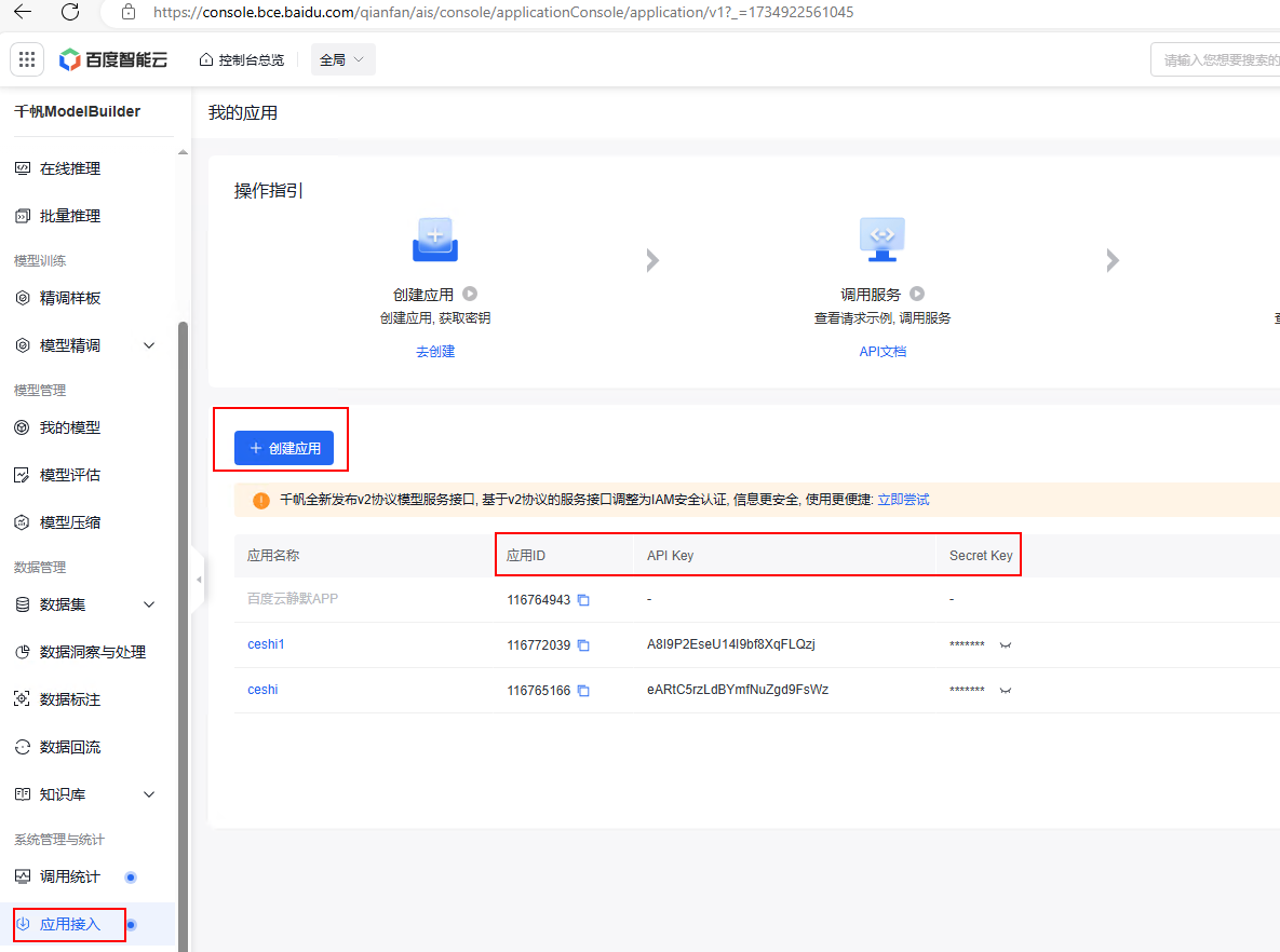 1、在网上搜索文心一言 API 使用教程,按照操作登录百度智能云后先创建应用申请一个 API 获取密钥