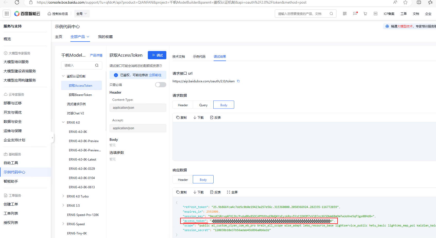 跳转到进入示例代码中心调试调用 API 获取 access_token